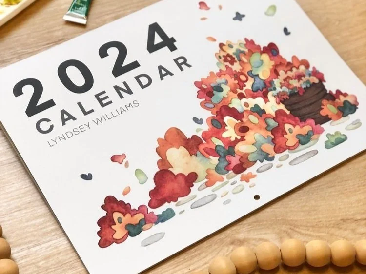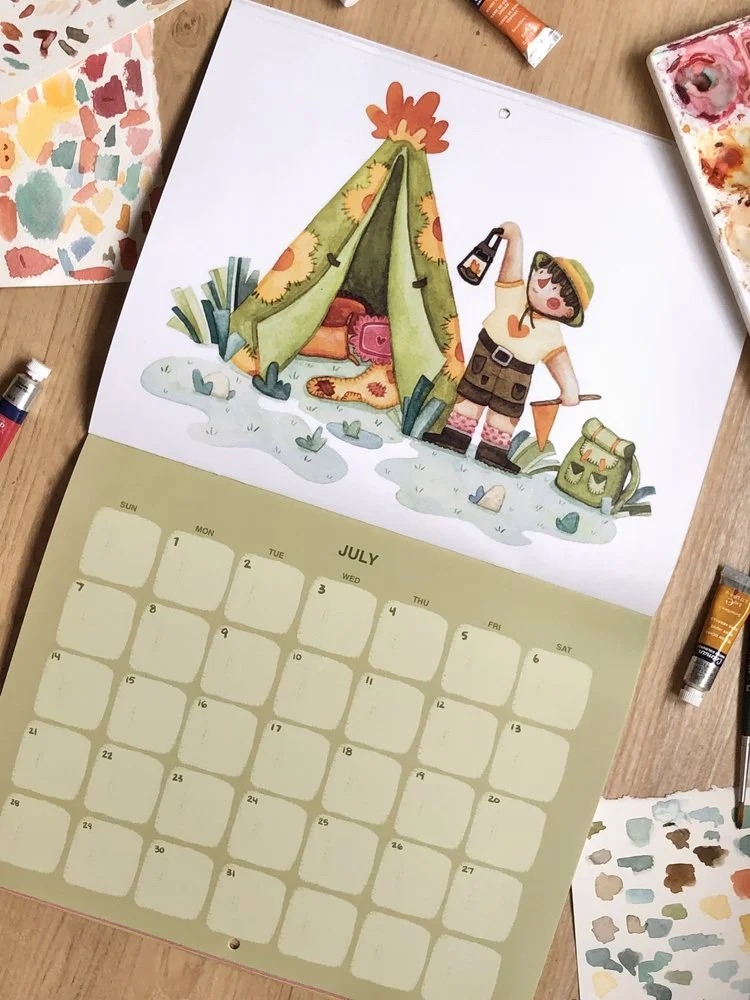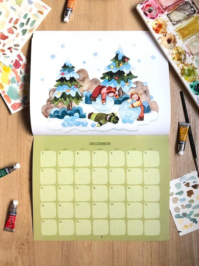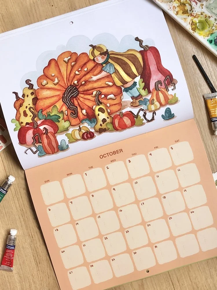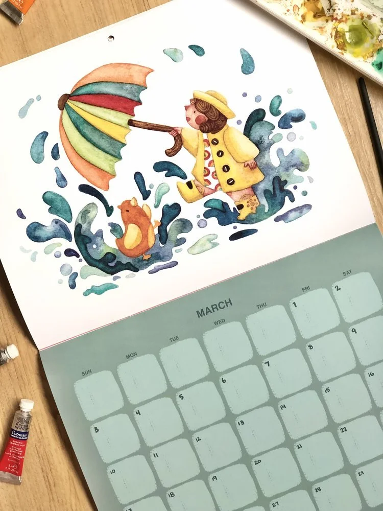 These twelve original illustrations were hand painted with watercolor. Each month captures a seasonal theme of childlike wonderment and the joys of everyday life.